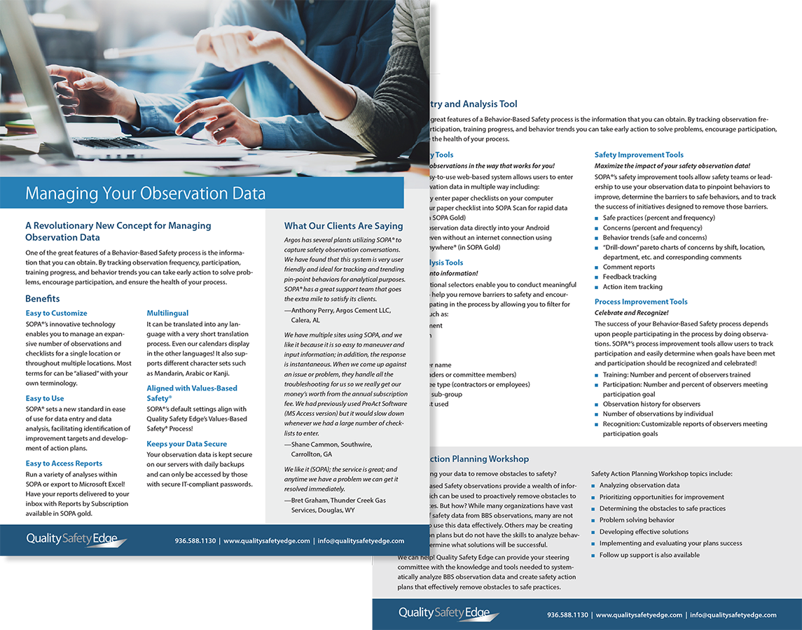 Quality Safety Edge is a pioneer in behavior-based safety with more than 25 years of proven results. QSE has experience implementing customized behavior-based safety processes on a global scale. By customizing each process and creating training materials unique to each business, QSE has adapted BBS to companies in over 30 nations.